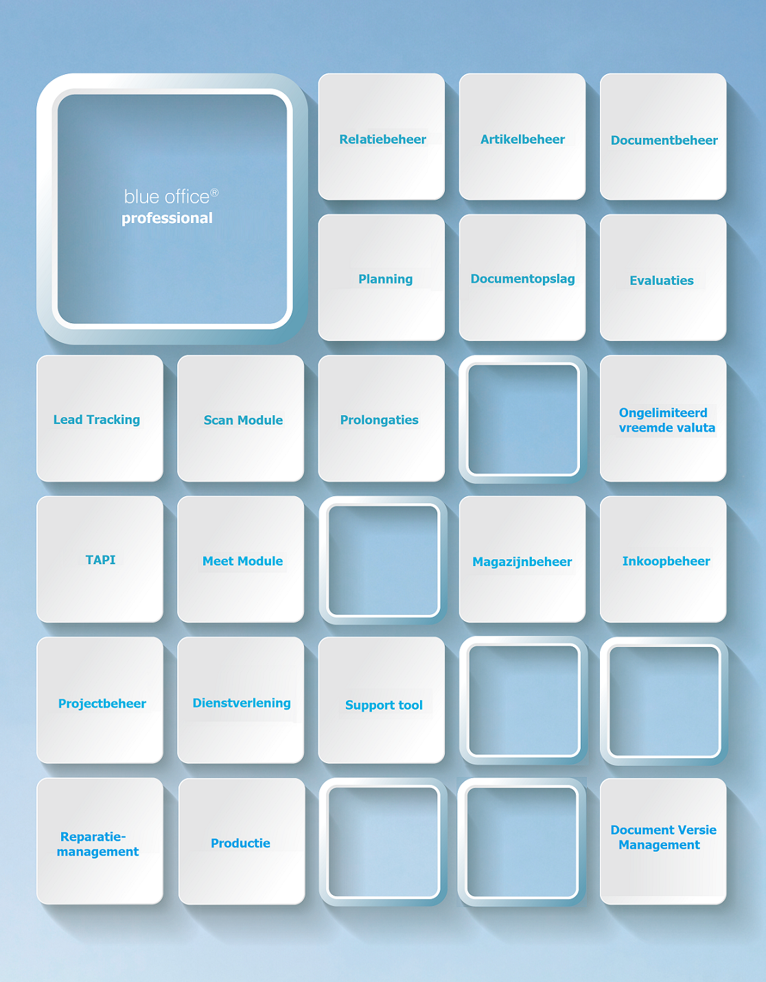 Deze blue office® versie maakt de precieze planning en implementatie van complexe taken en processen in productiebedrijven op een eenvoudige en begrijpelijke manier mogelijk. Processen kunnen optimaal inzichtelijk worden gemaakt en beheerd in een eenduidig systeem.