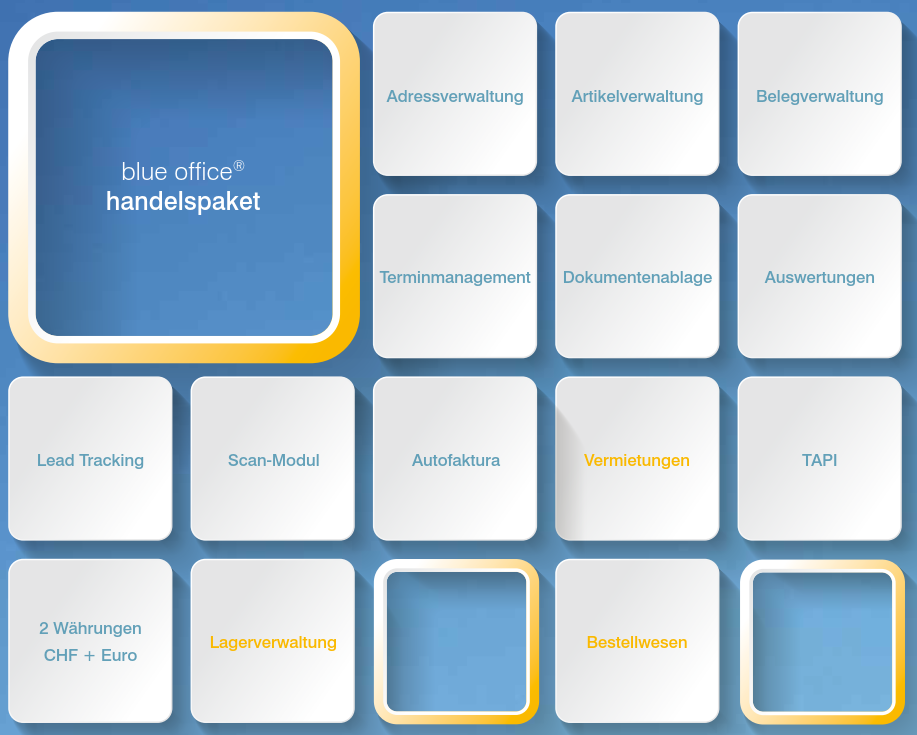 Bei Bedarf kann das blue office® handelspaket durch Zusatzmodule weiter individuell ausgebaut werden.