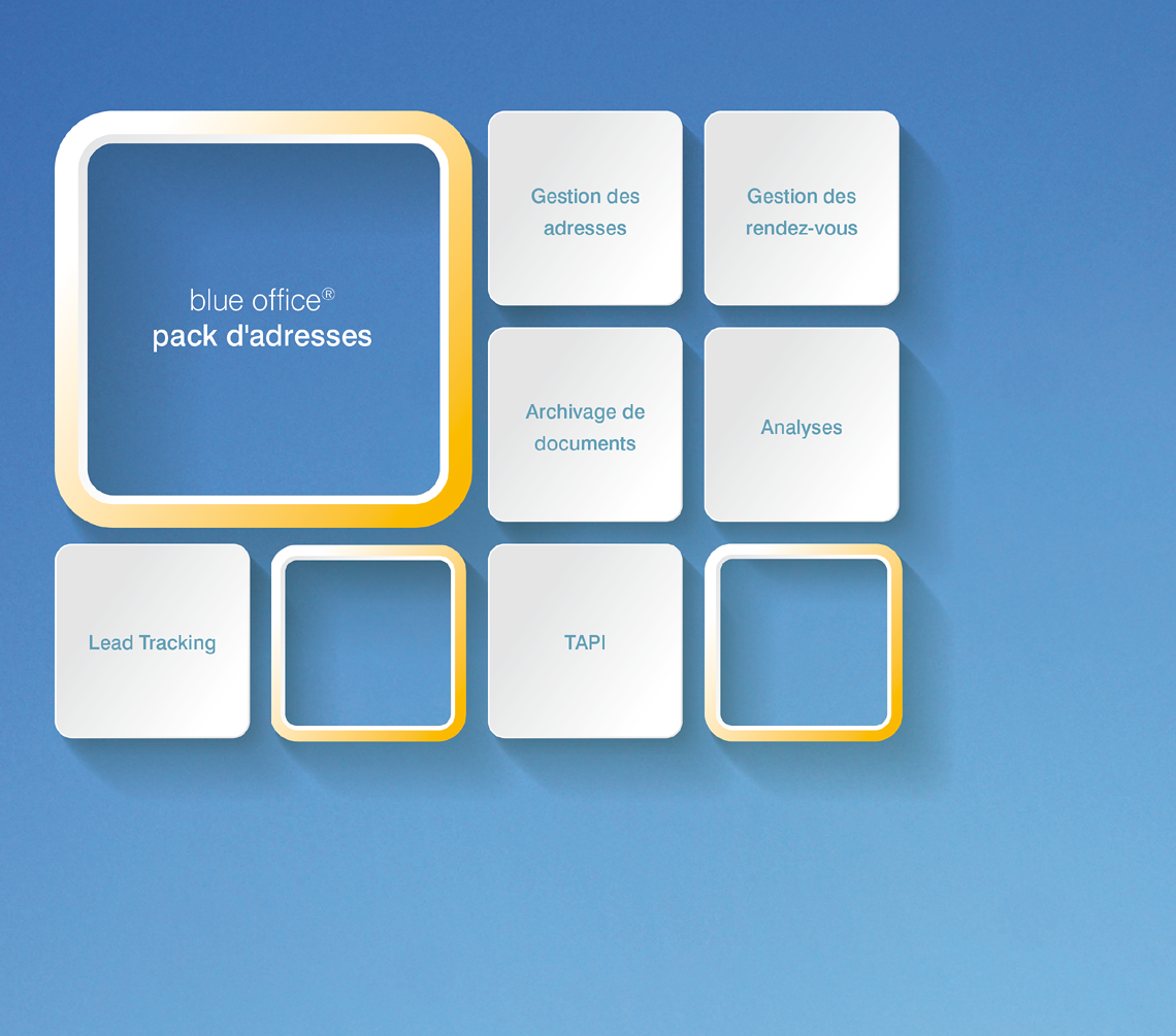 Le pack d'adresses blue office® constitue la solution d'entrée de gamme économique pour une gestion professionnelle des adresses. Des critères de sélection et des filtres pouvant être librement définis vous permettent de vous adresser à vos clients de manière ciblée.